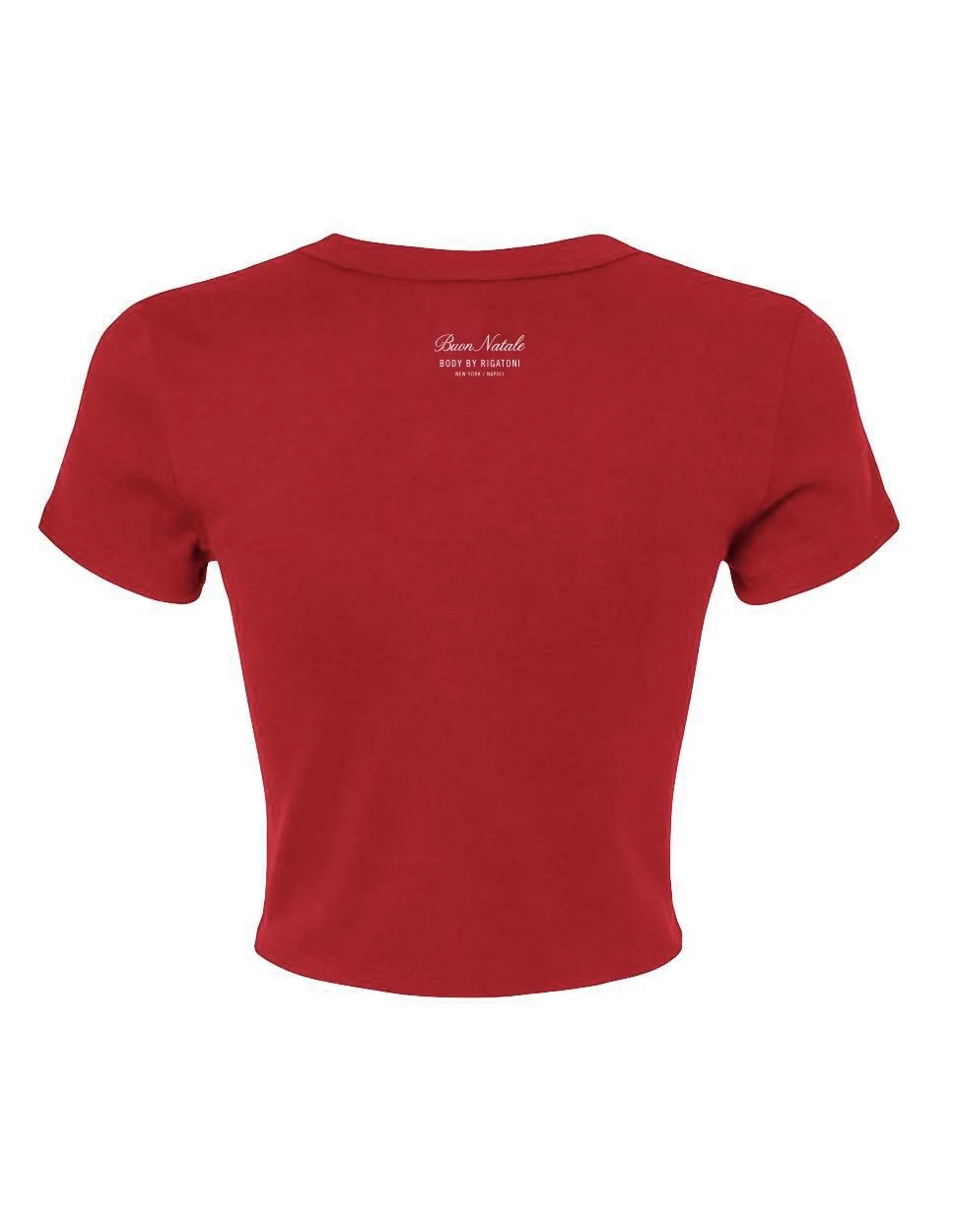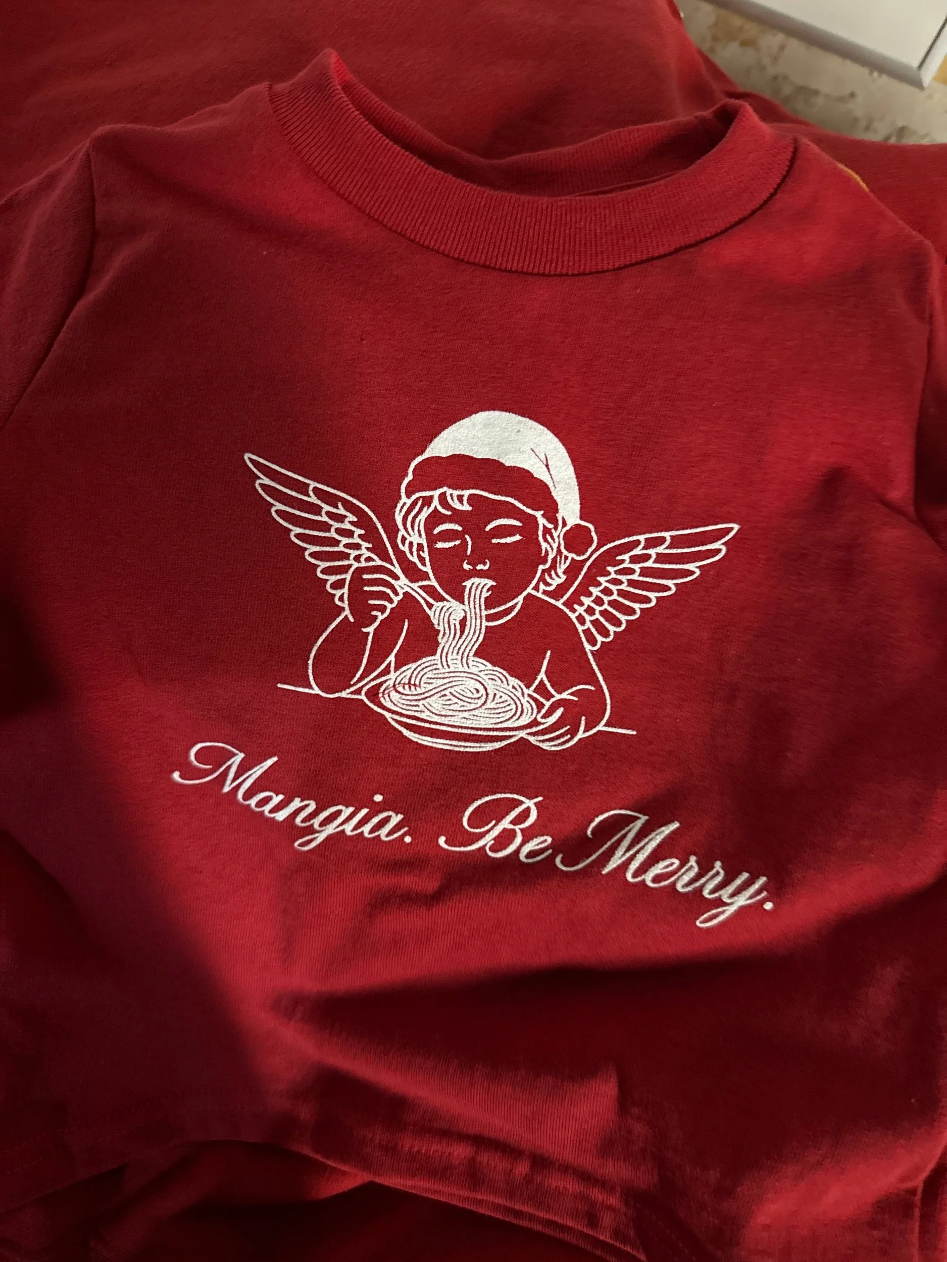 Celebrate Christmas the Italian way with pasta, family, and plenty of joy. The “Mangia. Be Merry.” crop top features an angel designed in a festive Santa hat eating spaghetti. This collection is for the ones who believe: food is love, family is everything, and holidays are more chaotic when there’s pasta involved.