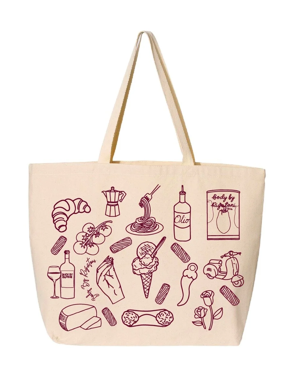 From a collaborative creation inspired by my friend Alessandra, her namesake tote was born. Our paths crossed through Janine, the talented owner of Homemade by Bruno, known for her pasta, gelato-making, and recipes showcased on Instagram and in her shop. Intrigued by Janine's recommendation to meet Alessandra, I drove to Philadelphia with my family from Italy, where we all connected. Our friendship grew through Instagram conversations mainly about our shared love of Italy and our passion for eating. Although we do have a shared love of authentic Italian food, when we are together we always find ourselves eating tacos. With Alessandra's support, Body By Rigatoni became a reality. Walking the Brooklyn Bridge one day, sharing my dreams for BBR, Alessandra mentioned her husband Ryan's ability to screen print the apron my mom had originally designed. From that moment on the bridge, Body By Rigatoni felt achievable. The “Alessandra Tote” is inspired by Alessandra living in America, but always missing and keeping Italy in her heart. Eventually we found ourselves having late nights, drinking espresso at 2AM, & chugging Pellagrino brainstorming everything Italian that could represent the “Alessandra Tote.”